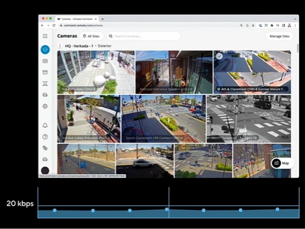 Our cameras store footage locally and send encrypted thumbnails to the cloud, streaming only when viewed. With bandwidth as low as 20-50 kbps, easily scale to thousands of cameras per location. potential.